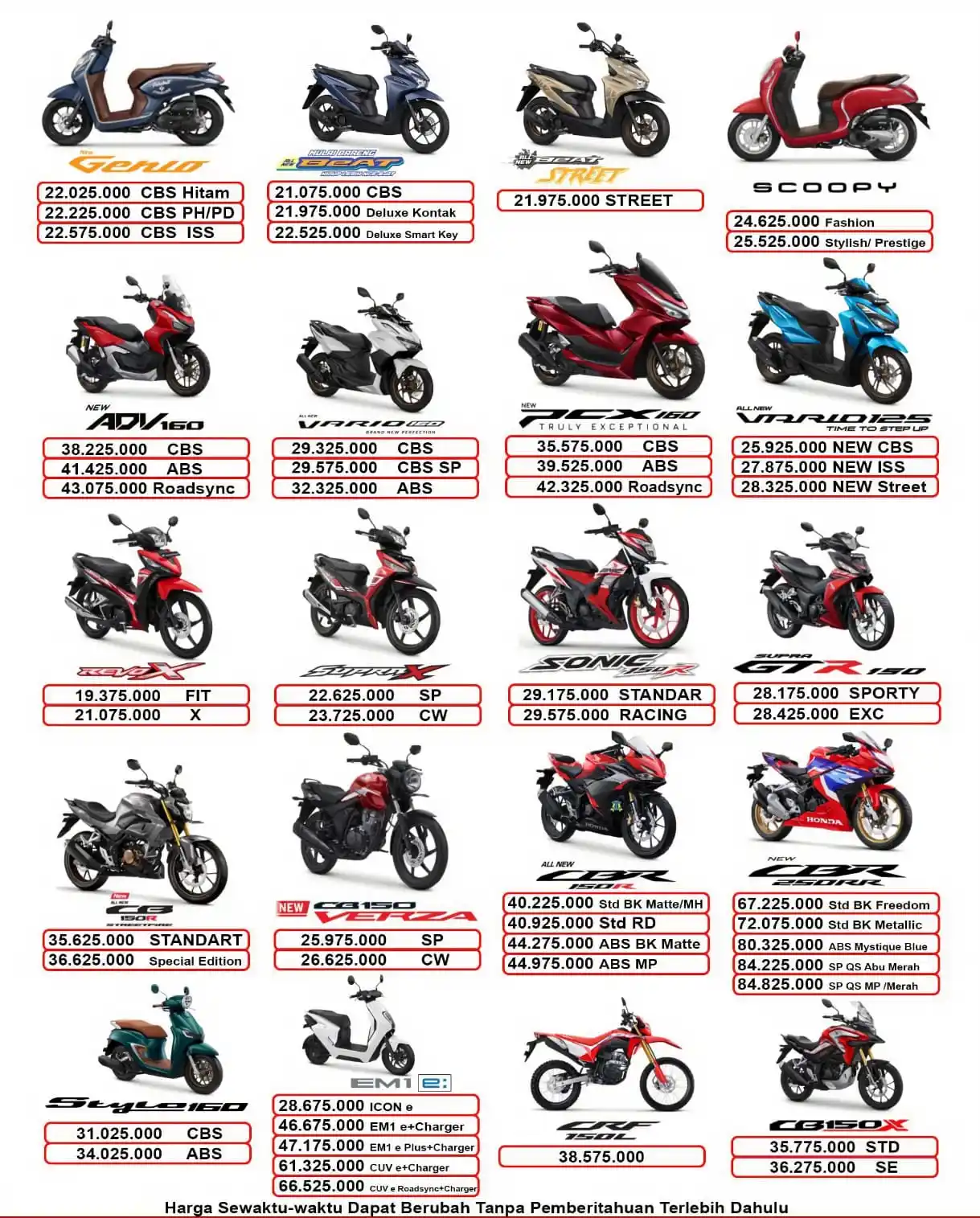 Berikut adalah Daftar Harga sepeda motor honda On The Road untuk wilayah Pasuruan dan sekitarnya. Brosur Promo Kredit Motor Honda Pasuruan. Daftar Harga OTR di bawah adalah harga terbaru namun tidak mengikat dan dapat berubah sewaktu waktu.